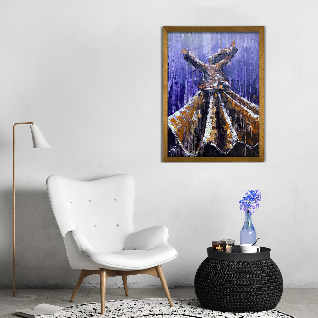 "In this mesmerizing piece,a whirling dervish is set against a rich, indigo background, evoking a sense...