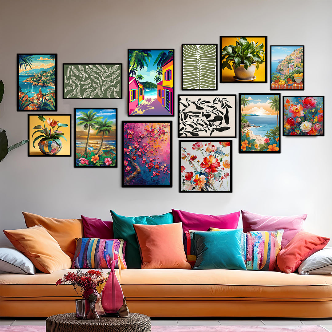 Large1=16x24,2=14x20,2=12x16,1=8x12,1=12x12,1=12x10,1=12x8,1=10x16 Medium 2=12x18,1=16x20,2=10x12,1=6x8,1=10x10,1=12x8,1=10x8,1=6x10 Mentioned all sizes are in inches Frame with border. This elegant design...