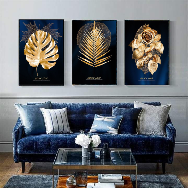 Golden Tropical with Blue Background Modern Wall Art-3 Panel