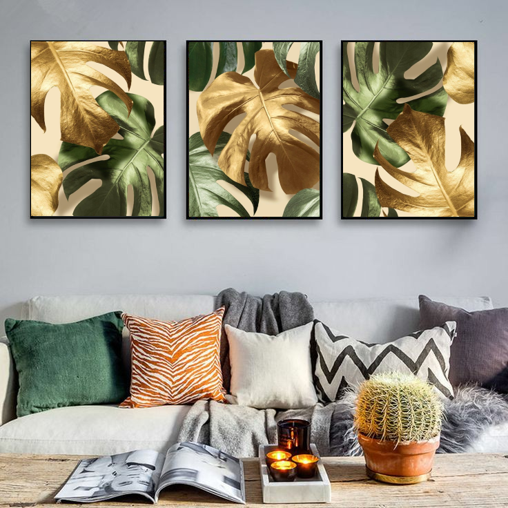 Golden Glimmer Monstera Wall Art-3 Panel