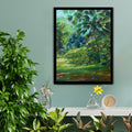 is a serene landscape of trees, greenery,